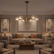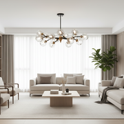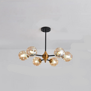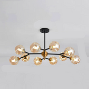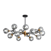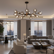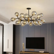 This multi globe branch style ceiling light features spherical glass shades arranged along branching metal arms. Available in configurations with 6, 10, 15, or 20 lamps for varied visual scale.